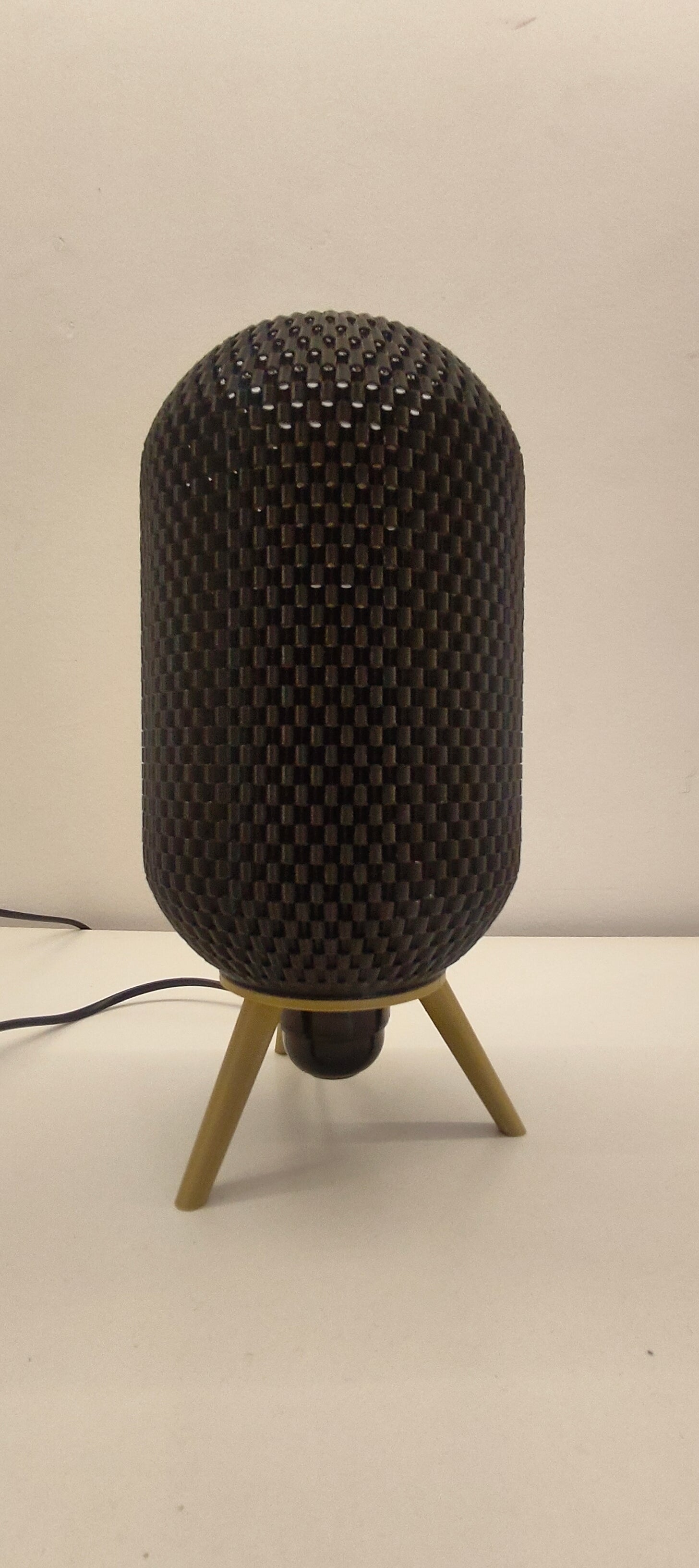 Illuminate any space with this modern 3D printed lamp, featuring an intricate geometric pattern that casts mesmerizing light and shadow effects across the room. Expertly crafted using sustainable and eco-friendly materials, the lightweight lampshade creates a warm, ambient glow perfect for bedrooms, living areas, or workspaces. The sturdy tripod base ensures both stability and style, making this lamp an ideal accent for minimalist, contemporary, or eclectic décor. Designed with innovative 3D printing technology, this lamp not only enhances your environment but also embodies a commitment to sustainability. Its seamless structure and user-friendly on/off switch offer convenience and ease of use, while the distinct pattern turns every lit moment into a visual experience.